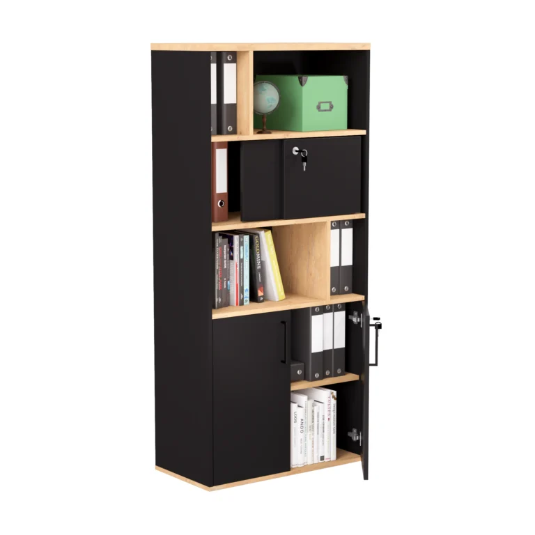 - Szafa biurowa LOFT CLARO 5OH – to półotwarta szafa o solidnej konstrukcji, która łączy funkcję ekspozycyjną z miejscem zabezpieczonej przestrzeni. Górna część mebla jest otwarta — idealna na segregatory i bieżące dokumenty, które chcemy mieć szybko pod ręką — natomiast dolna część stanowi zamykaną na klucz przestrzeń z trzema półkami, w której można umieścić akta wymagające większej ochrony.