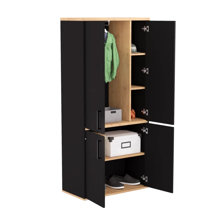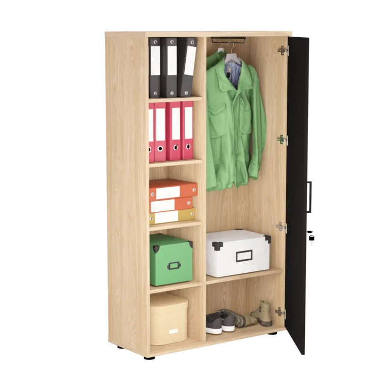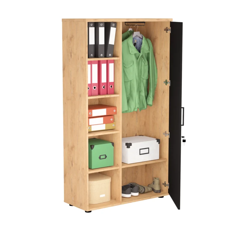 W ofercie naszych szaf do biura znajdują się także modele wyposażone w wieszak na ubrania. Z naszego doświadczenia wynika, że szczególnie w małych biurach (o ograniczonej powierzchni) szafy często łączą funkcję przechowywania odzieży wierzchniej z miejscem na akcesoria biurowe. Tego rodzaju szafy są dość uniwersalne — sprawdzą się zarówno w strefach wejściowych, jak i bezpośrednio przy stanowiskach pracy. Dzięki podziałowi na część z drążkiem na wieszaki oraz półki lub zamykaną przestrzeń, można w nich wygodnie przechować płaszcze, torby, a jednocześnie segregatory, zapasowe materiały biurowe czy dokumenty. To praktyczne rozwiązanie, które pozwala zaoszczędzić miejsce i utrzymać porządek nawet w niewielkim biurze.