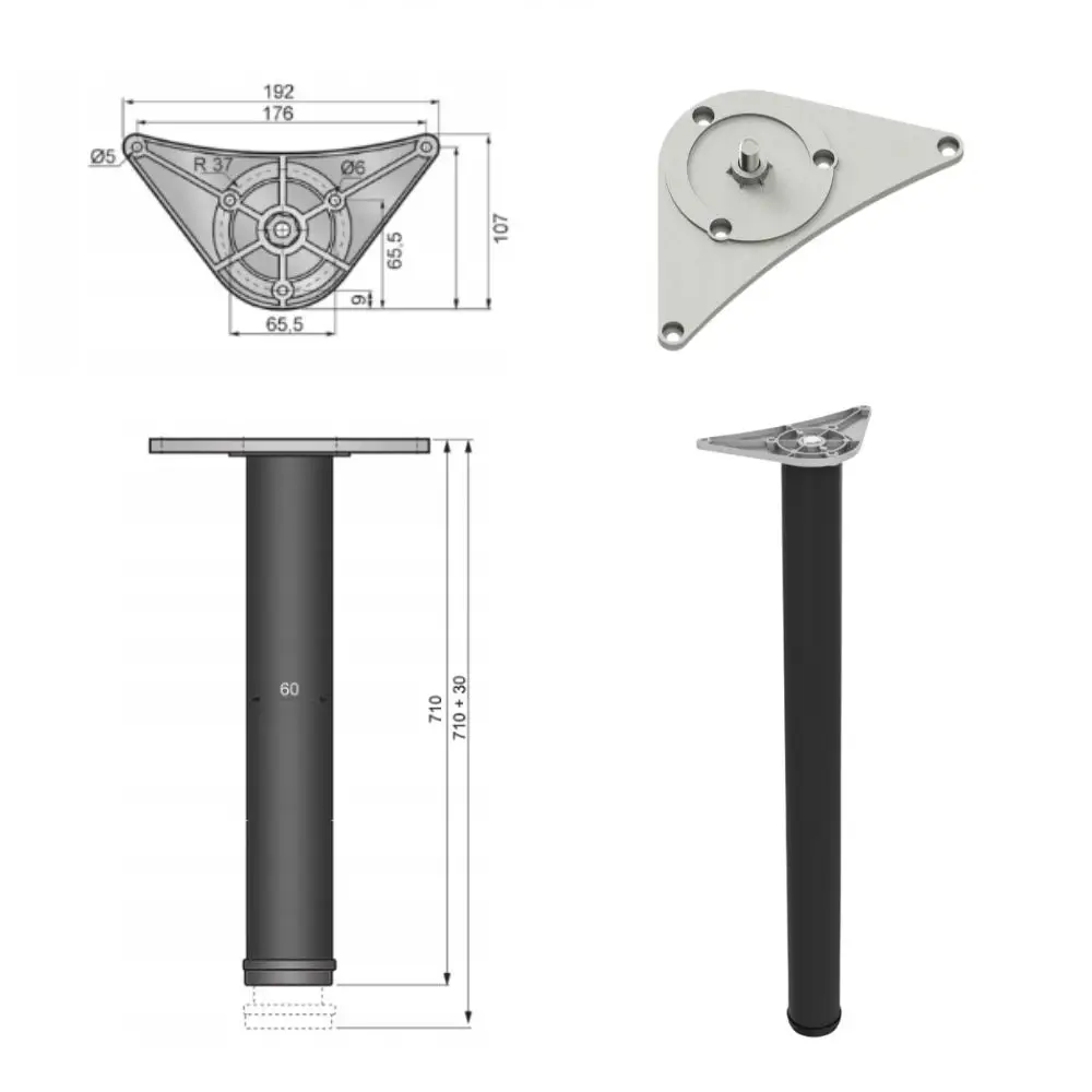 Stelaż biurka składa się z czterech nóg okrągłych o wysokości 710 mm. Stelaż posiada możliwość regulacji stopki do 30 mm, co pozwala na stabilne ustawienie biurka nawet na nierównych powierzchniach.