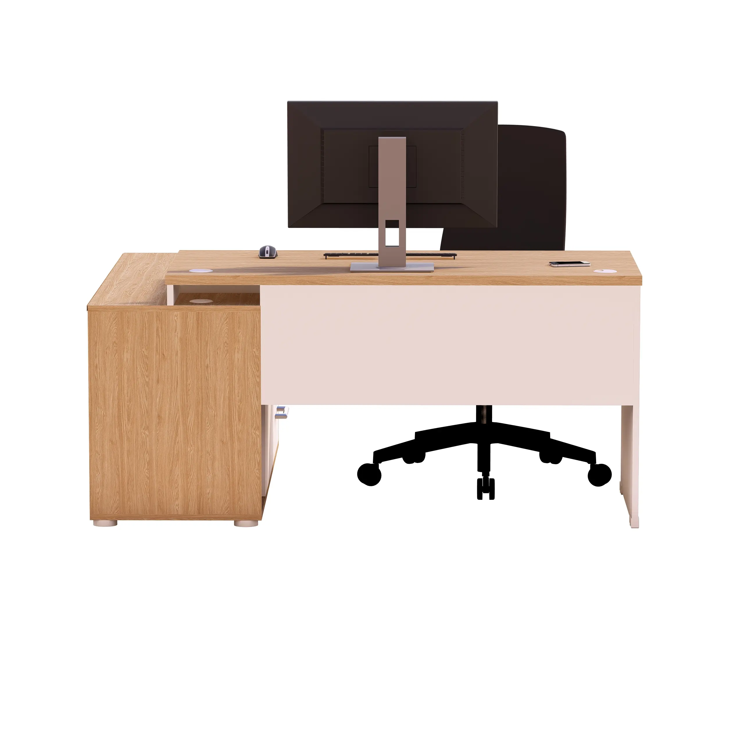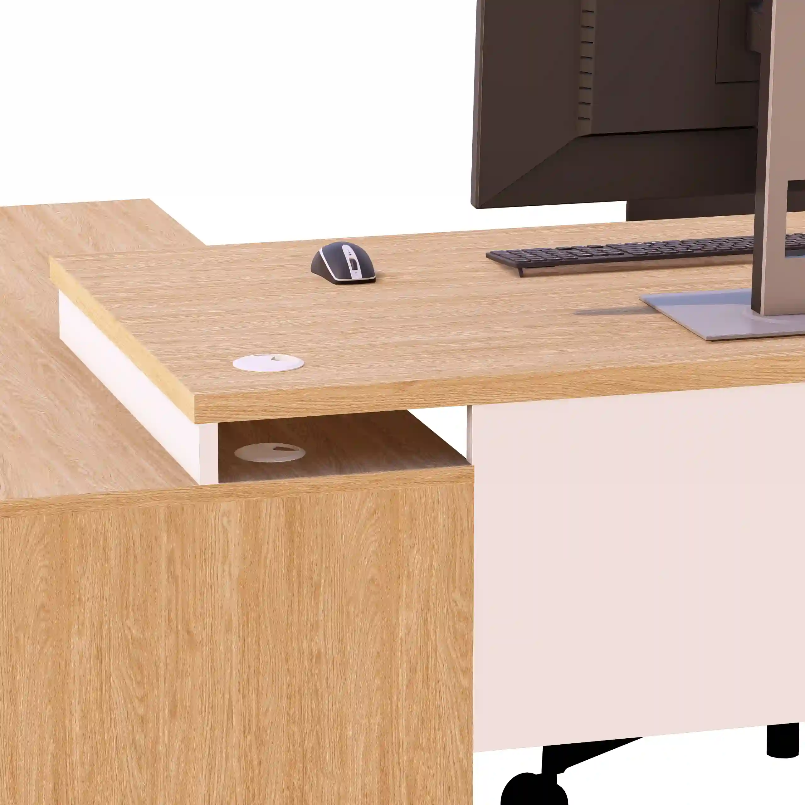 Komoda, na której opiera się biurko, wykonana z płyty wiórowej laminowanej dodaje przestrzeni do przechowywania dokumentów i innych potrzebnych przedmiotów. Wyposażona jest w trzy pojemne szuflady oraz część zamykaną z półką.