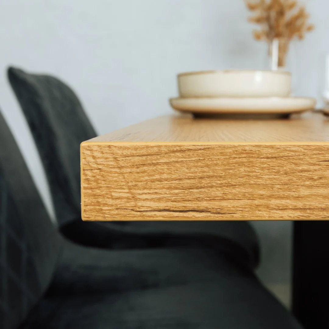 Prezentowany blat jest wykonany z laminowanej płyty meblowej Dąb Lancelot PD3023. Jest to wzór rustykalnego, naturalnego dębu z zachowaniem jego najbardziej charakterystycznych, surowych elementów. Ciepłe, miodowe wybarwienie z wyraźnie zaznaczonymi szczegółami ręcznej odbróbki drewna. Doskonale komponuje się zarówno z ciemnymi unikolorami (zieleń, burgund, granat), jak i z bielą, czernią oraz dekorami betonowymi i ciemnymi kamieniami.