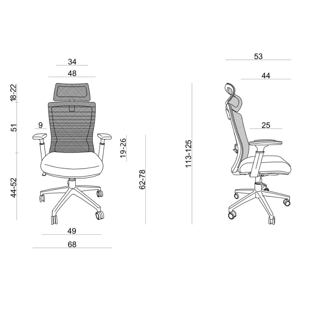 - Zagłówek i oparcie tapicerowane siatką, siedzisko tapicerowane tkaniną