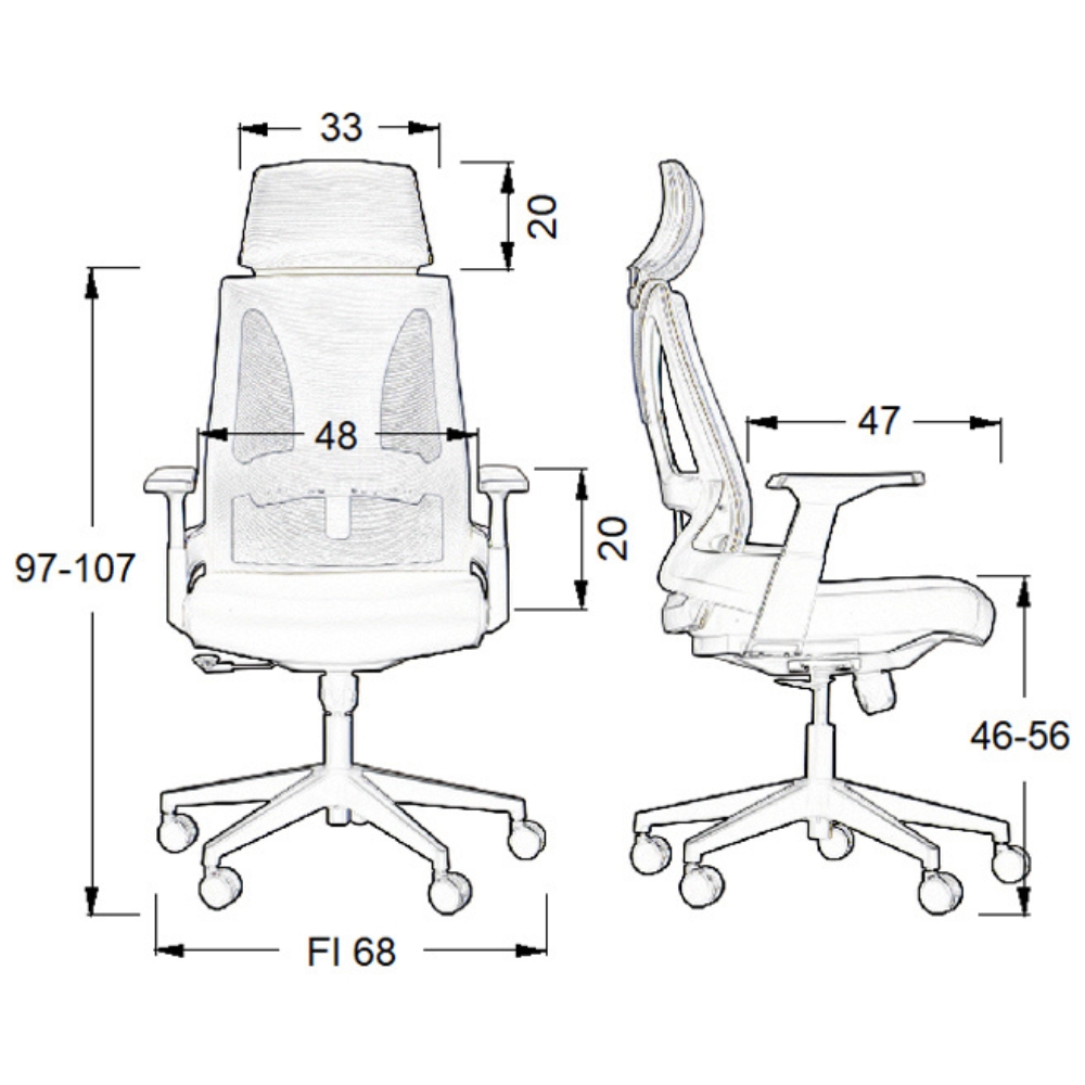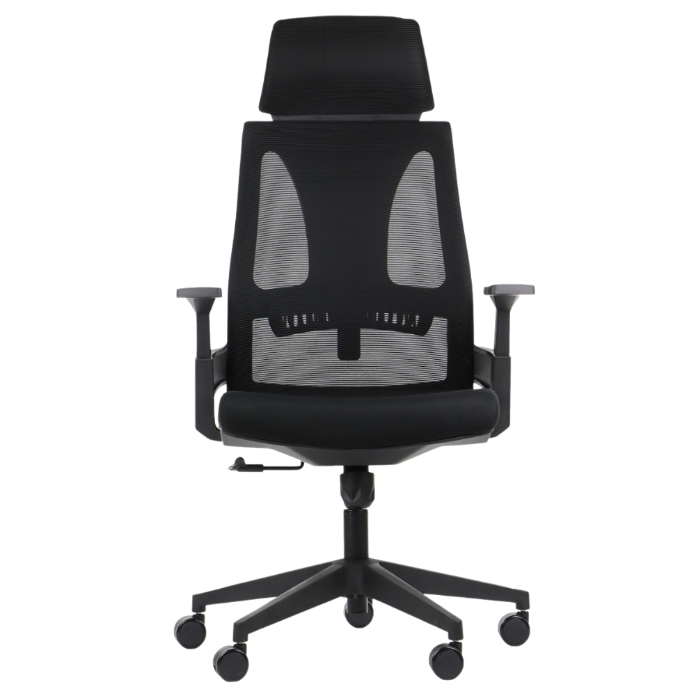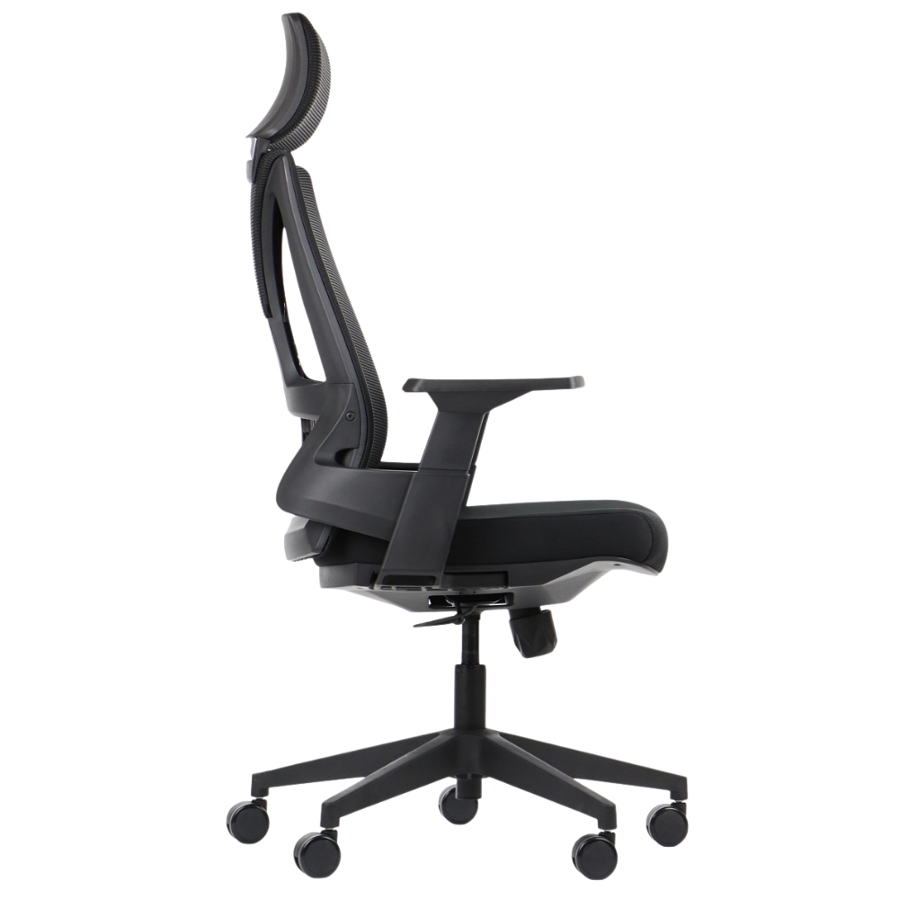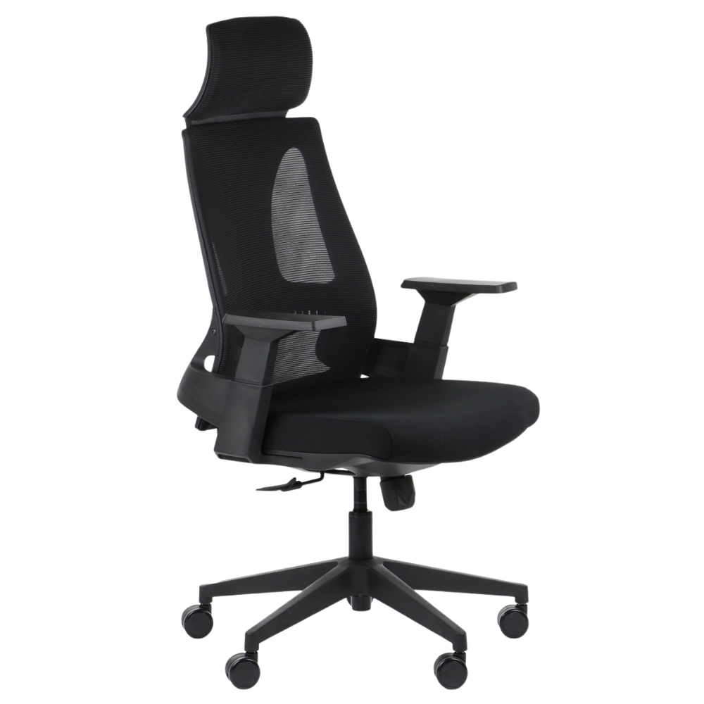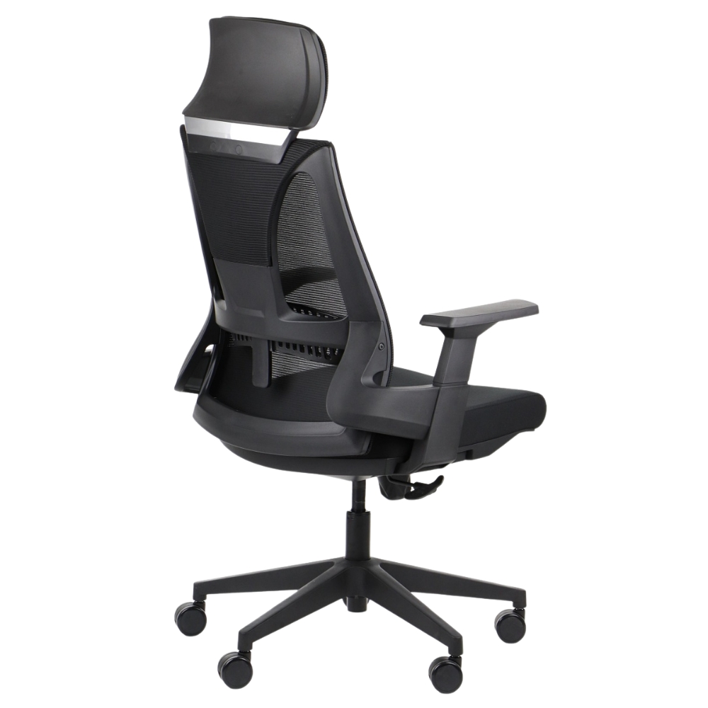 - Zagłówek i siedzisko tapicerowane tkaniną, oparcie tapicerowane siatką