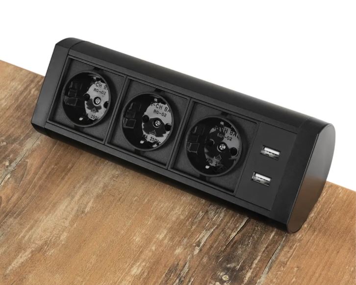 - Trzy gniazda 230 V – umożliwiają jednoczesne podłączenie kilku urządzeń elektrycznych, takich jak laptop, monitor czy drukarka.