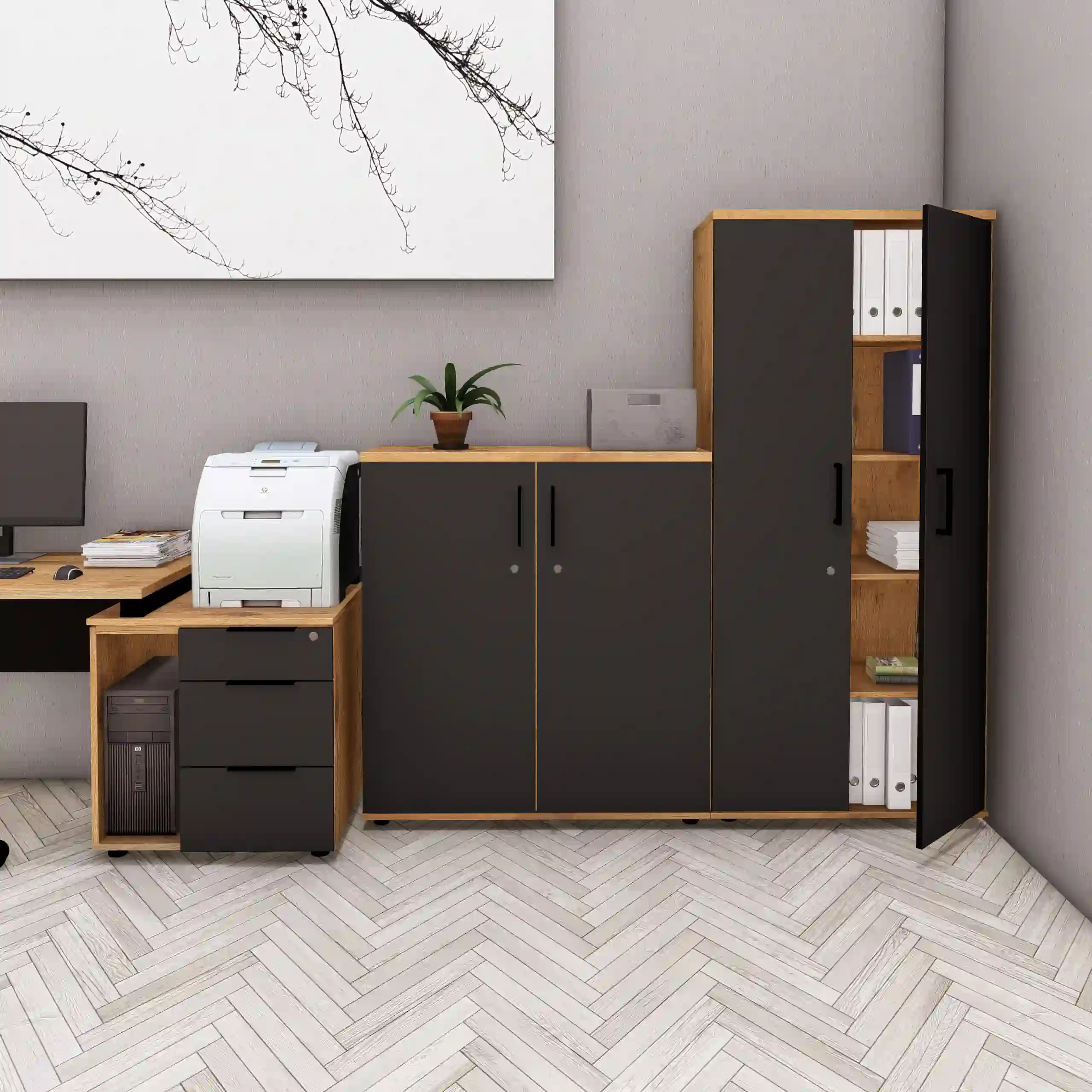 Komoda biurowa LOFT Dito to niezastąpiony element wyposażenia każdego nowoczesnego biura, zapewniający funkcjonalność i stylowe wykończenie przestrzeni pracy.