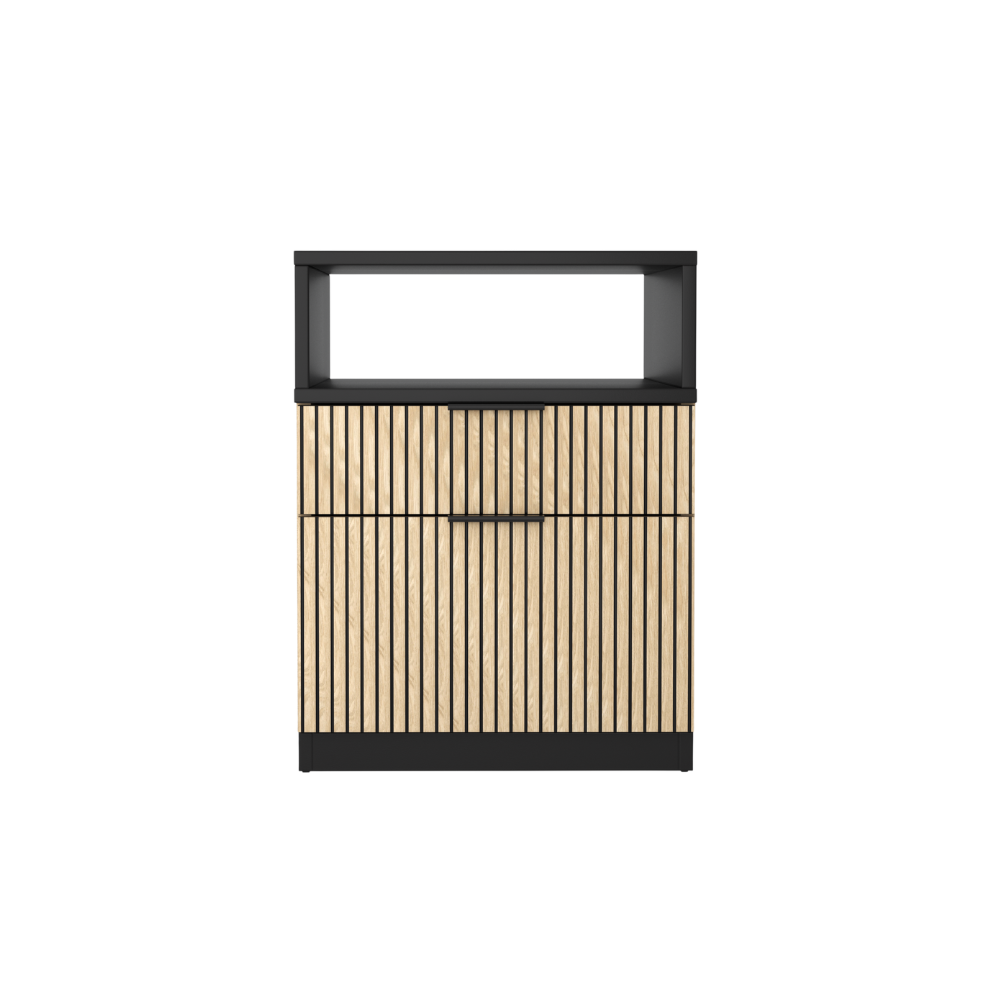 Dwie pojemne szuflady zapewniają wystarczającą przestrzeń do przechowywania, a metalowe uchwyty w kolorze czarnym dodają elegancji i nowoczesności. Wykonany z trwałej płyty meblowej, kontenerek jest odporny na zużycie i uszkodzenia, a jego poręczne rozmiary pozwalają na łatwe przenoszenie i umieszczanie go w dowolnym miejscu.