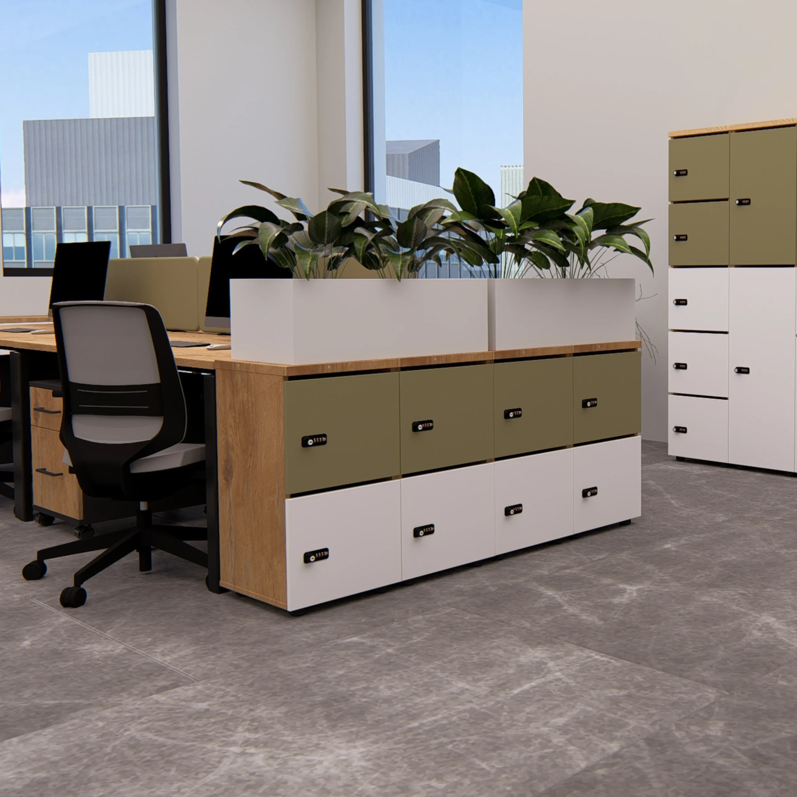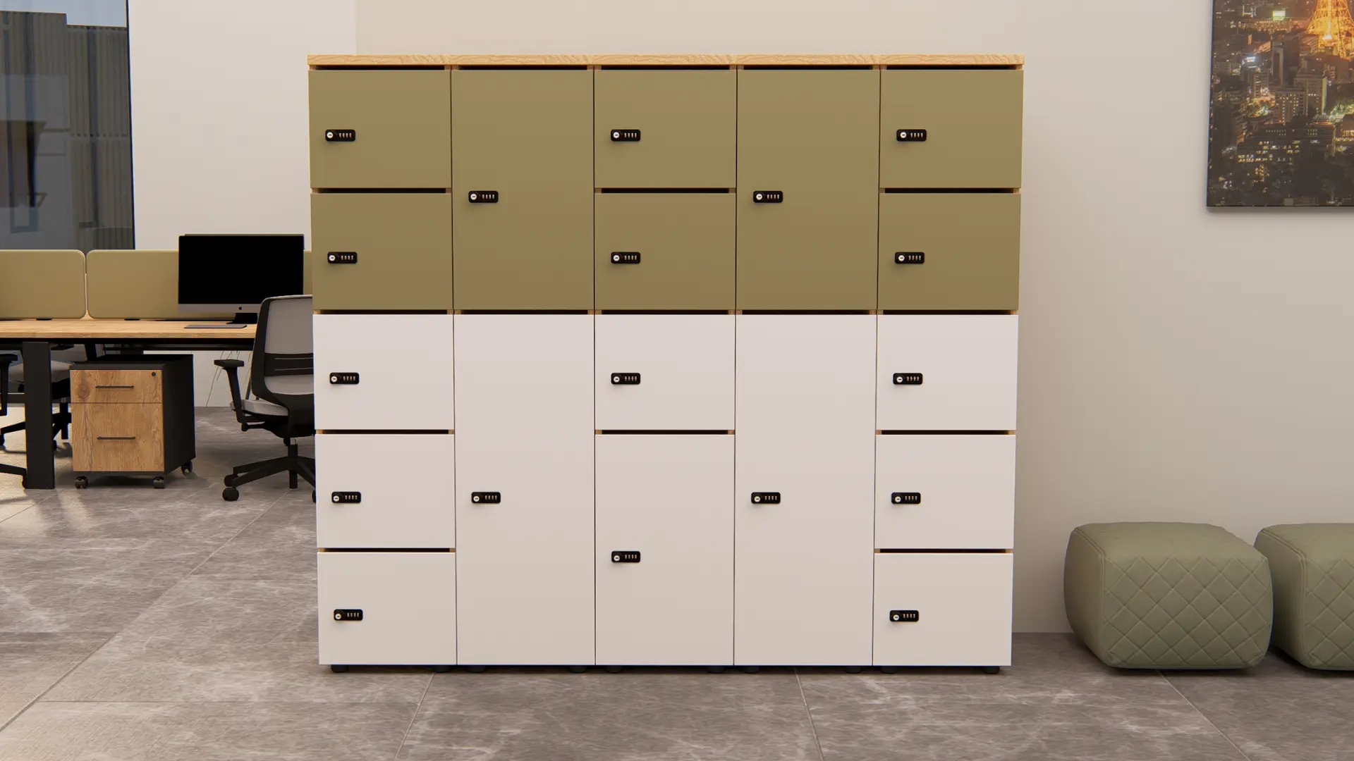 Przykładowy zestaw składający się z pięciu segmentów z frontami w dekorach Biel Perłowa i Eukaliptus. W jego skład wchodzą: 2x RENO 5OH (5 skrytek), 2x RENO 5OH 2D (2 skrytki), 1x RENO 5OH 4D (4 skrytki) Wszystkie segmenty zostały wyposażone w dodatkowe zamki szyfrowe.Skontaktuj się z nami, a pomożemy Ci skonfigurować idealny zestaw