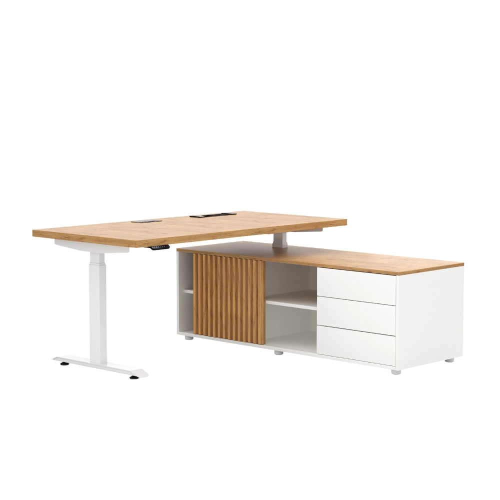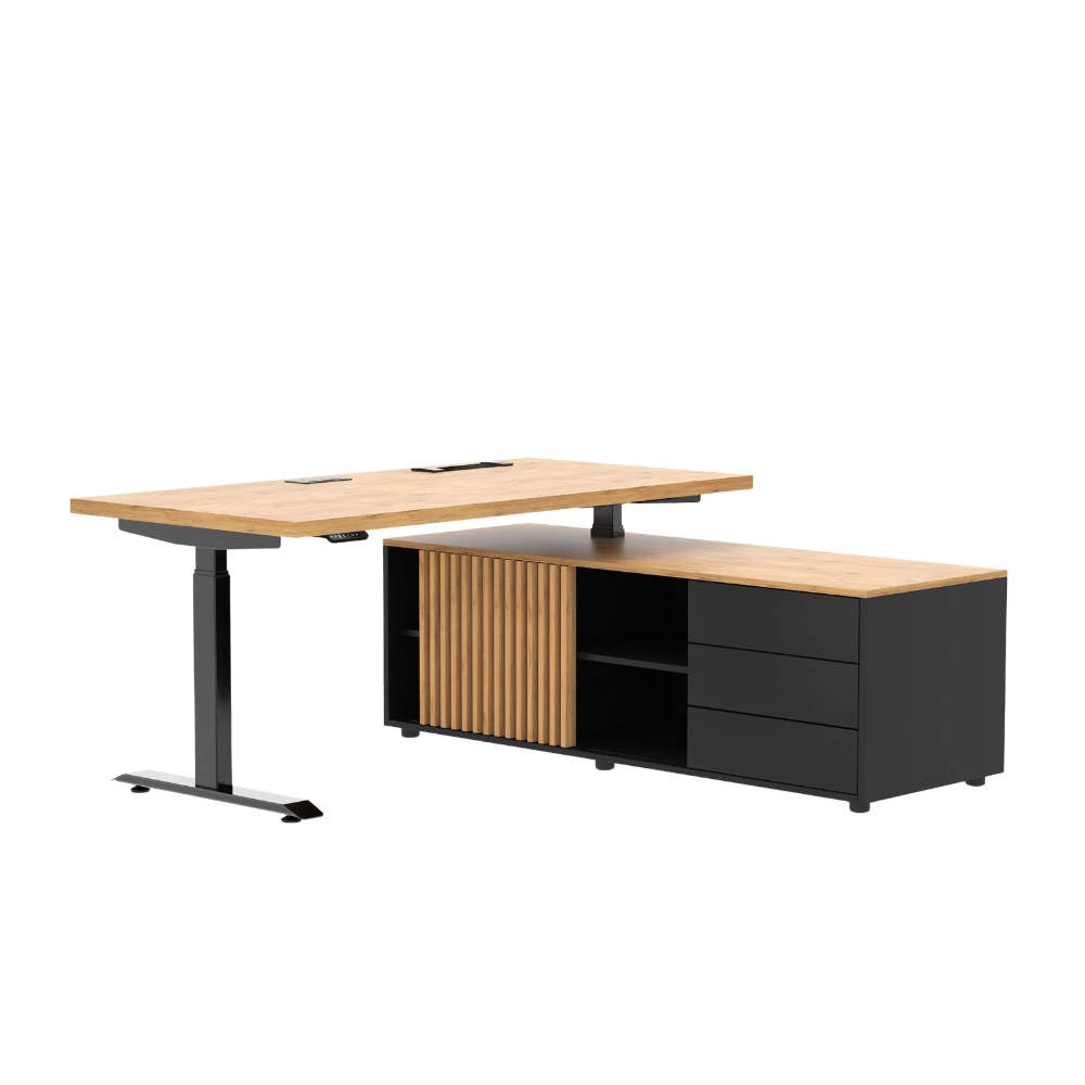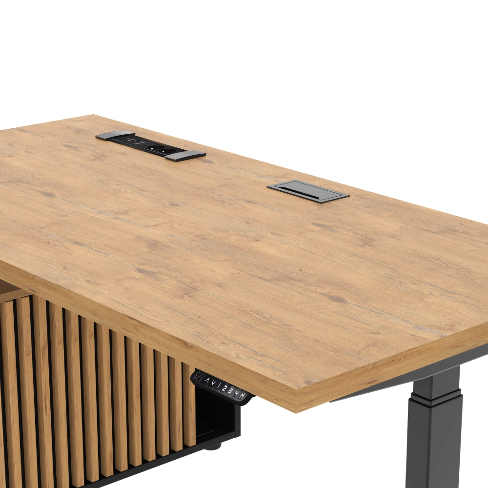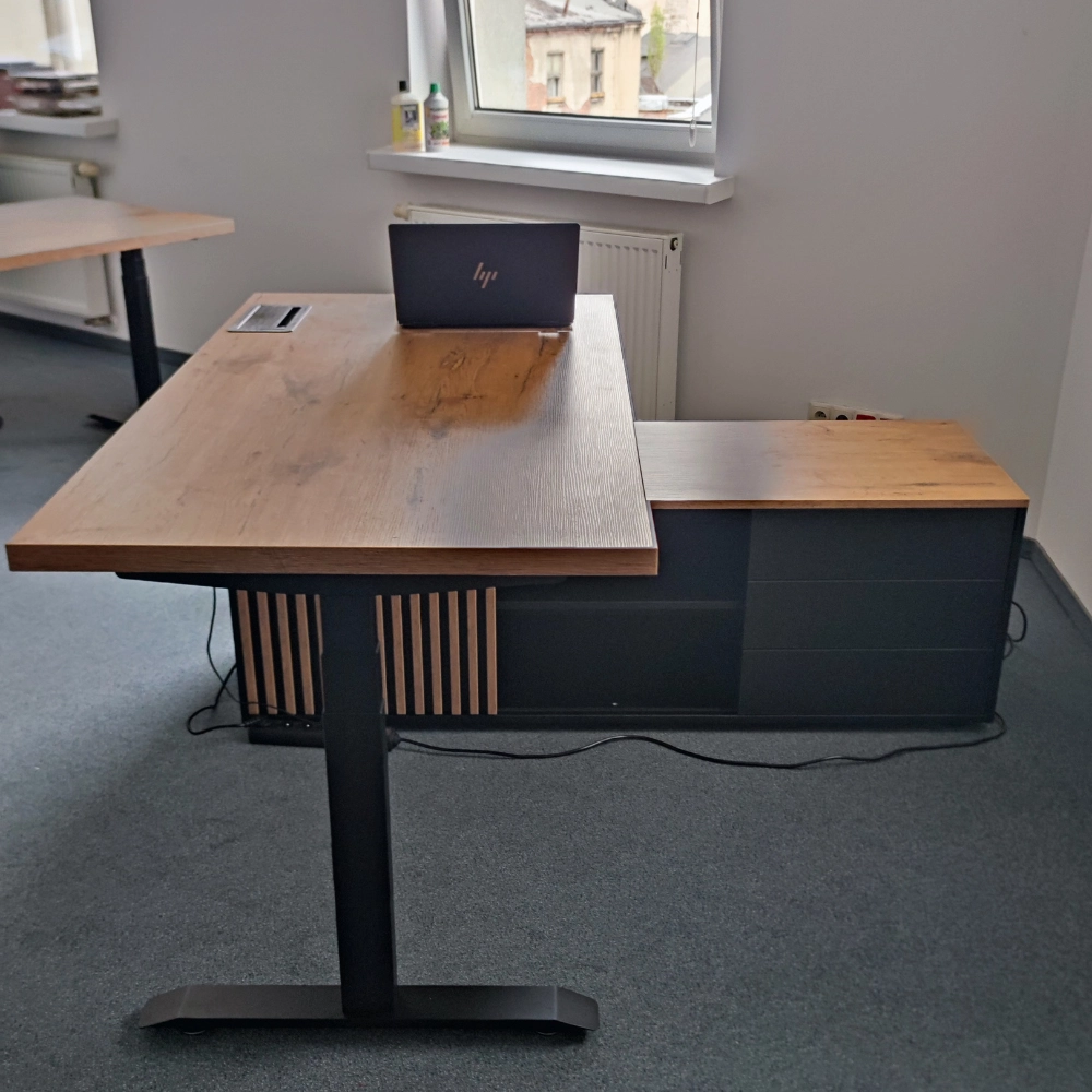 Nowoczesne biurko gabinetowe elektryczne Hero Desk Plus oparte na komodzie to idealne rozwiązanie dla osób poszukujących nowoczesnego i funkcjonalnego miejsca pracy. Zostało wykonane z wysokiej jakości materiałów, takich jak płyta wiórowa laminowana w eleganckim dekorze Dąb Lancelot. Blat o grubości 18 lub 36 mm zapewnia stabilność i trwałość.