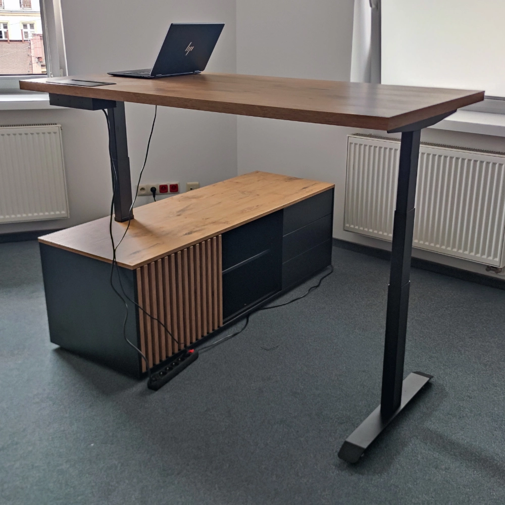 Dzięki zastosowaniu dwóch silników, biurko osiąga wyższą prędkość podnoszenia, co umożliwia szybkie dostosowanie wysokości blatu do preferencji użytkownika.