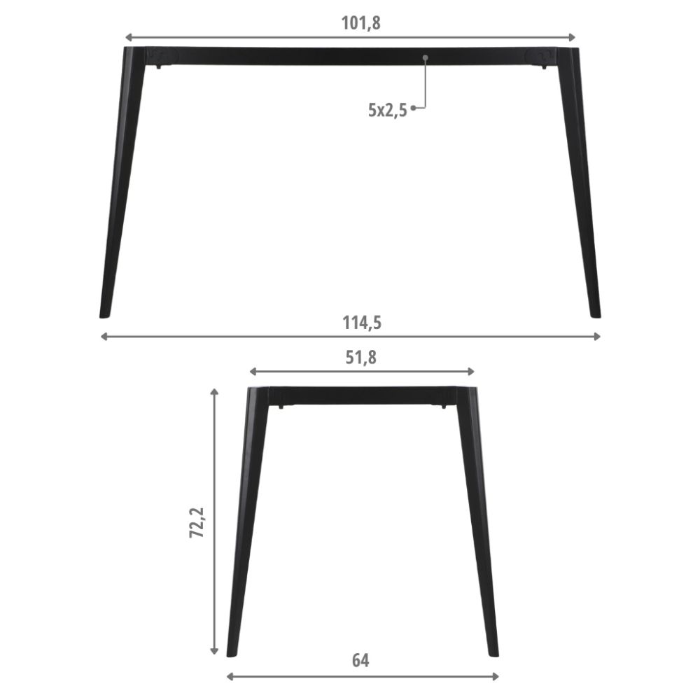 Wykonany z metalu malowanego proszkowo na czarno, dobrze wygląda i jest odporny na zarysowania. Stelaż jest skręcany, więc łatwo go złożyć. Belki mają przekrój 50×25 mm, a filcowe stopki na nogach zabezpieczają podłogę.