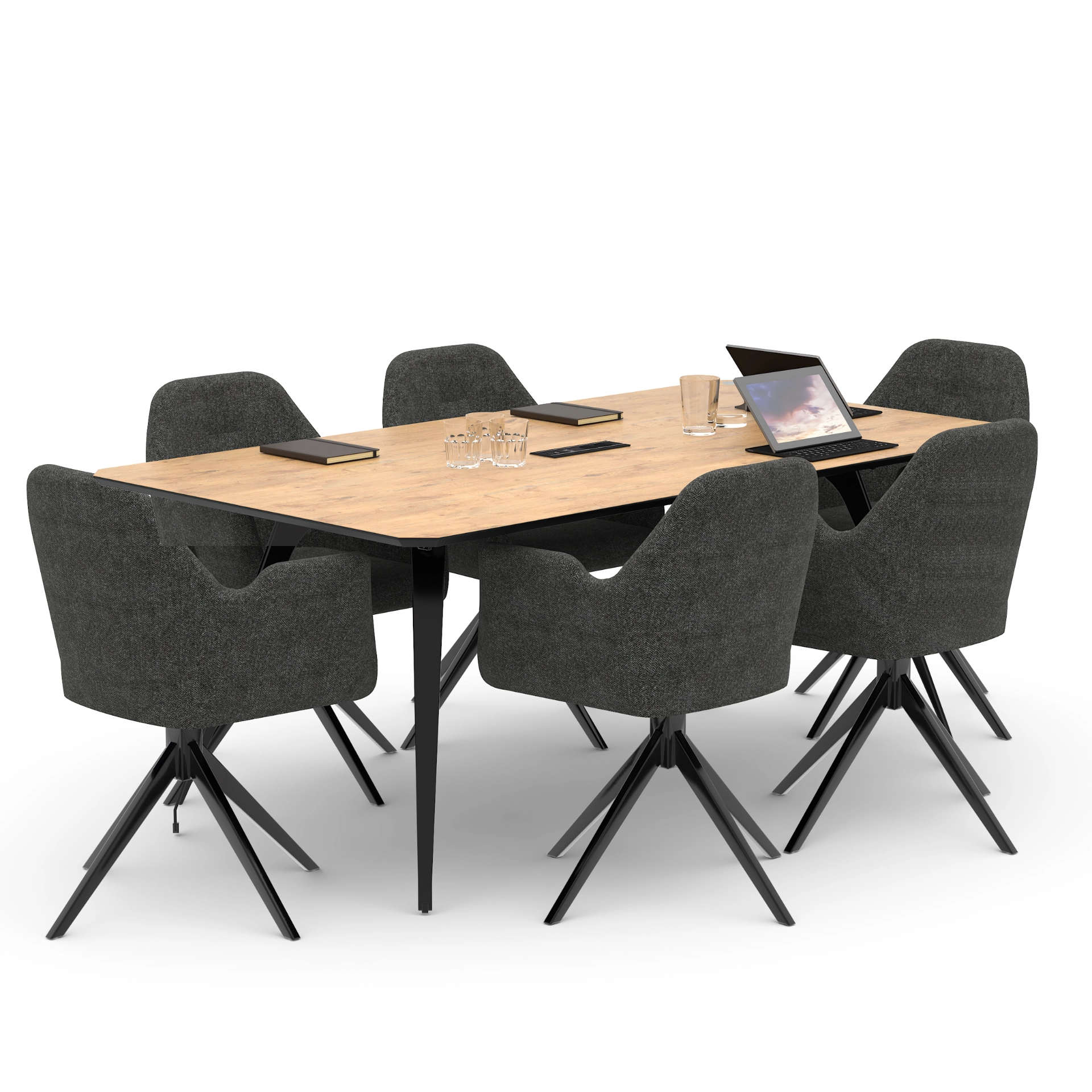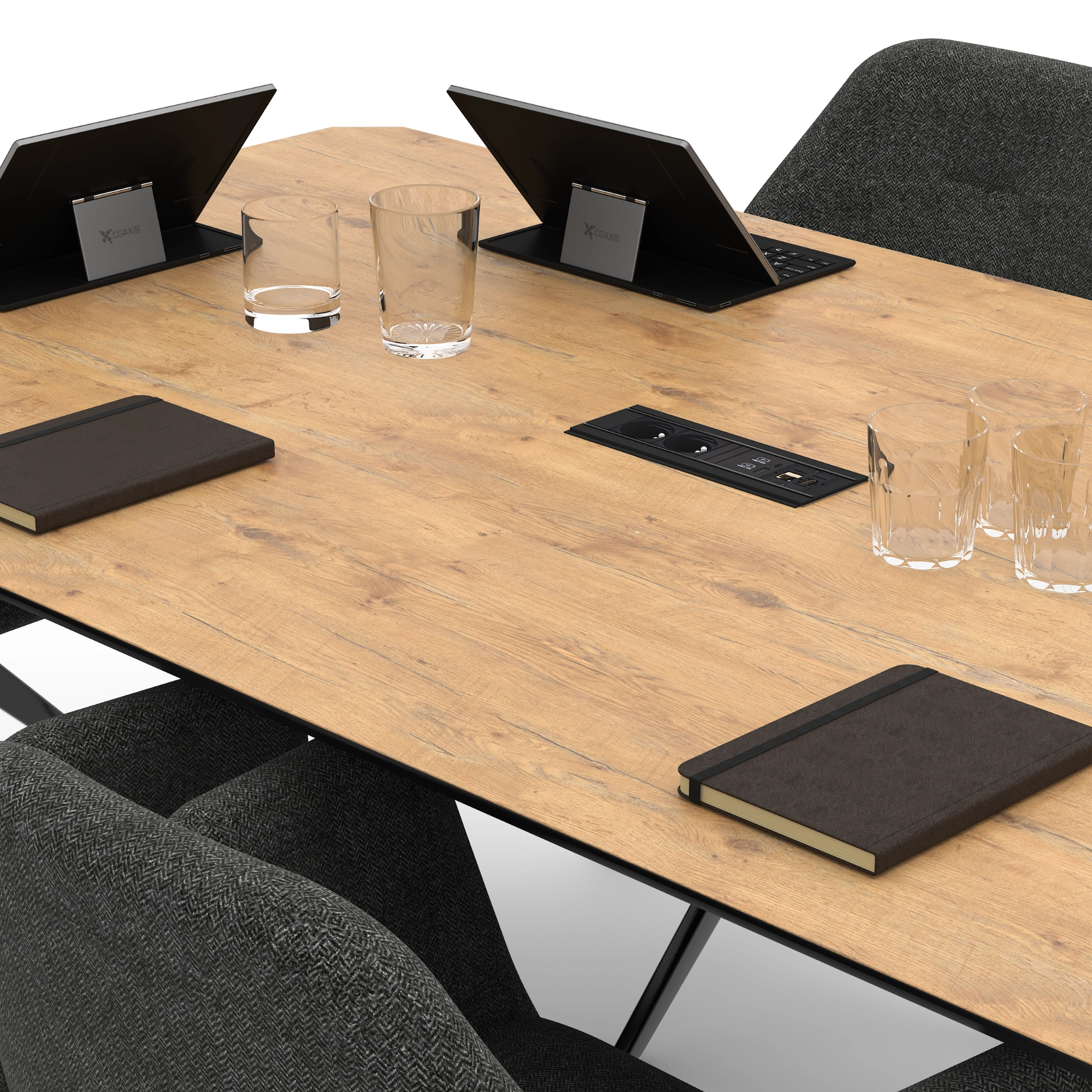 Ten detal ma znaczenie zarówno wizualne, jak i praktyczne. Stół zyskuje lżejszy, bardziej elegancki charakter, a jednocześnie pozostaje funkcjonalnym meblem konferencyjnym, przystosowanym do intensywnej pracy zespołowej. To wykończenie, które widać i czuć - szczególnie w przestrzeniach klasy premium.