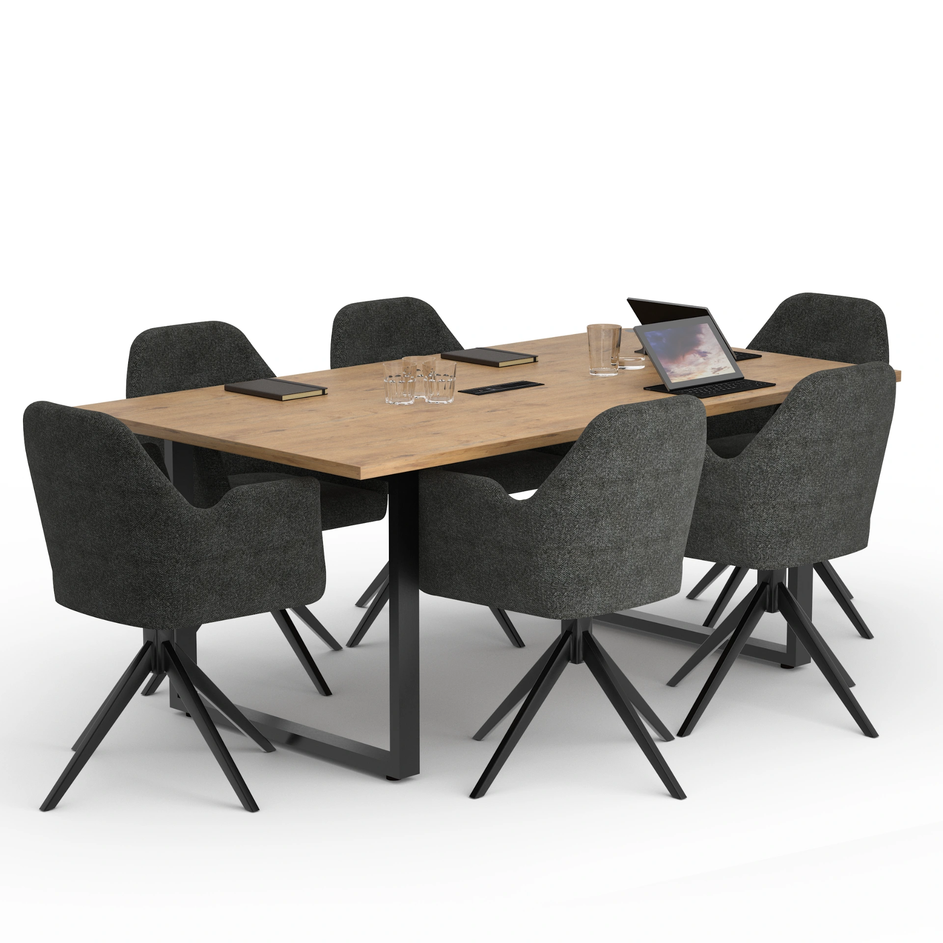 Stół konferencyjny to doskonałe rozwiązanie do biur, sal spotkań oraz różnego rodzaju przestrzeni konferencyjnych. Blat w dekorze Dąb Lancelot kontrastuje z pozostałymi elementami i podkreśla nowoczesny, stylowy charakter mebla.