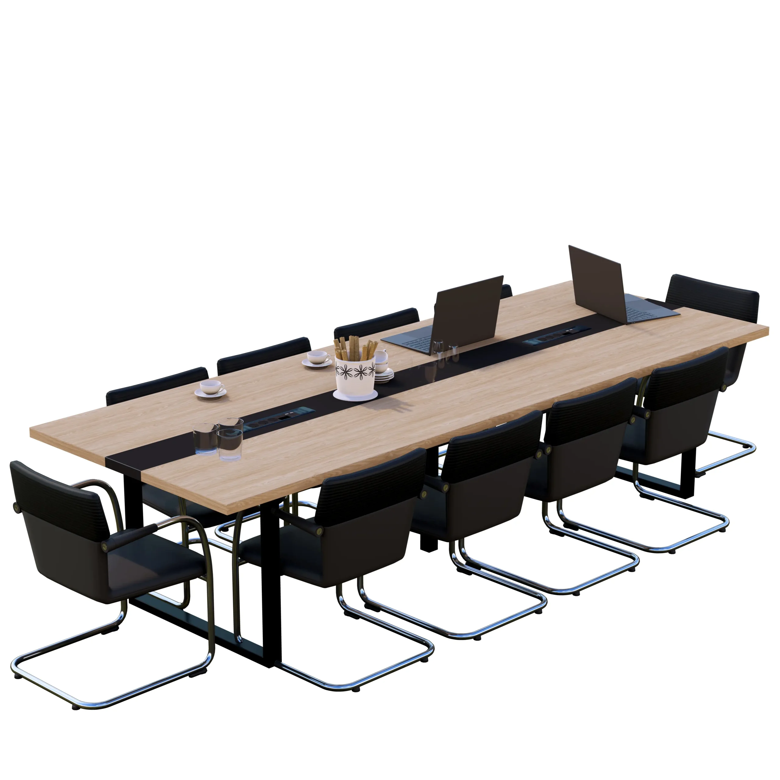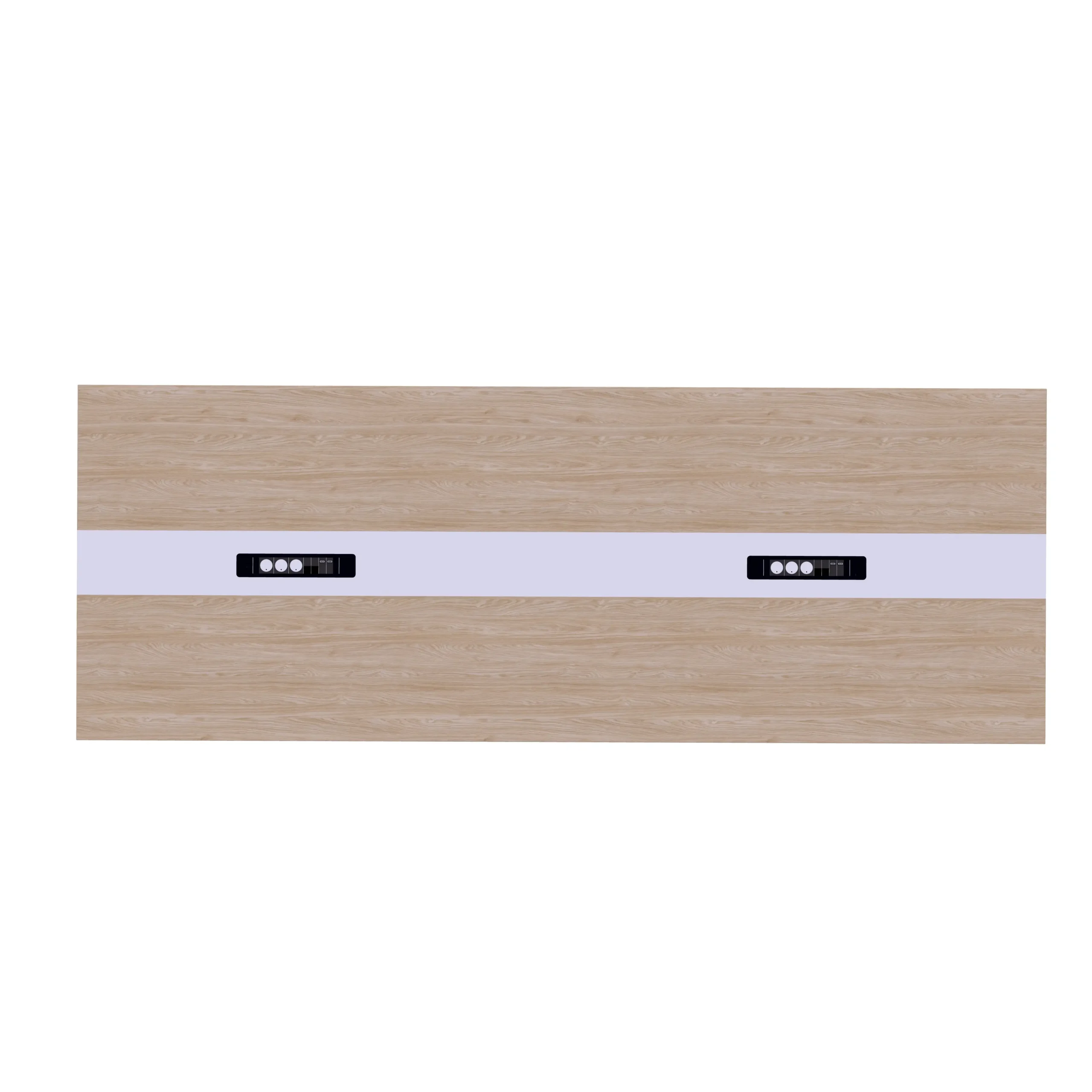 Stół konferencyjny jest zbudowany z trzech połączonych blatów to doskonałe rozwiązanie do biur, sal spotkań oraz przestrzeni konferencyjnych. Blaty zewnętrzne wykonane są w dekorze Dąb Olejowany, natomiast środkowy pas można wybrać w jednym z dwóch wariantów kolorystycznych: Czarny Onyx lub Biel Perłowa – oba świetnie kontrastują i podkreślają nowoczesny charakter mebla.