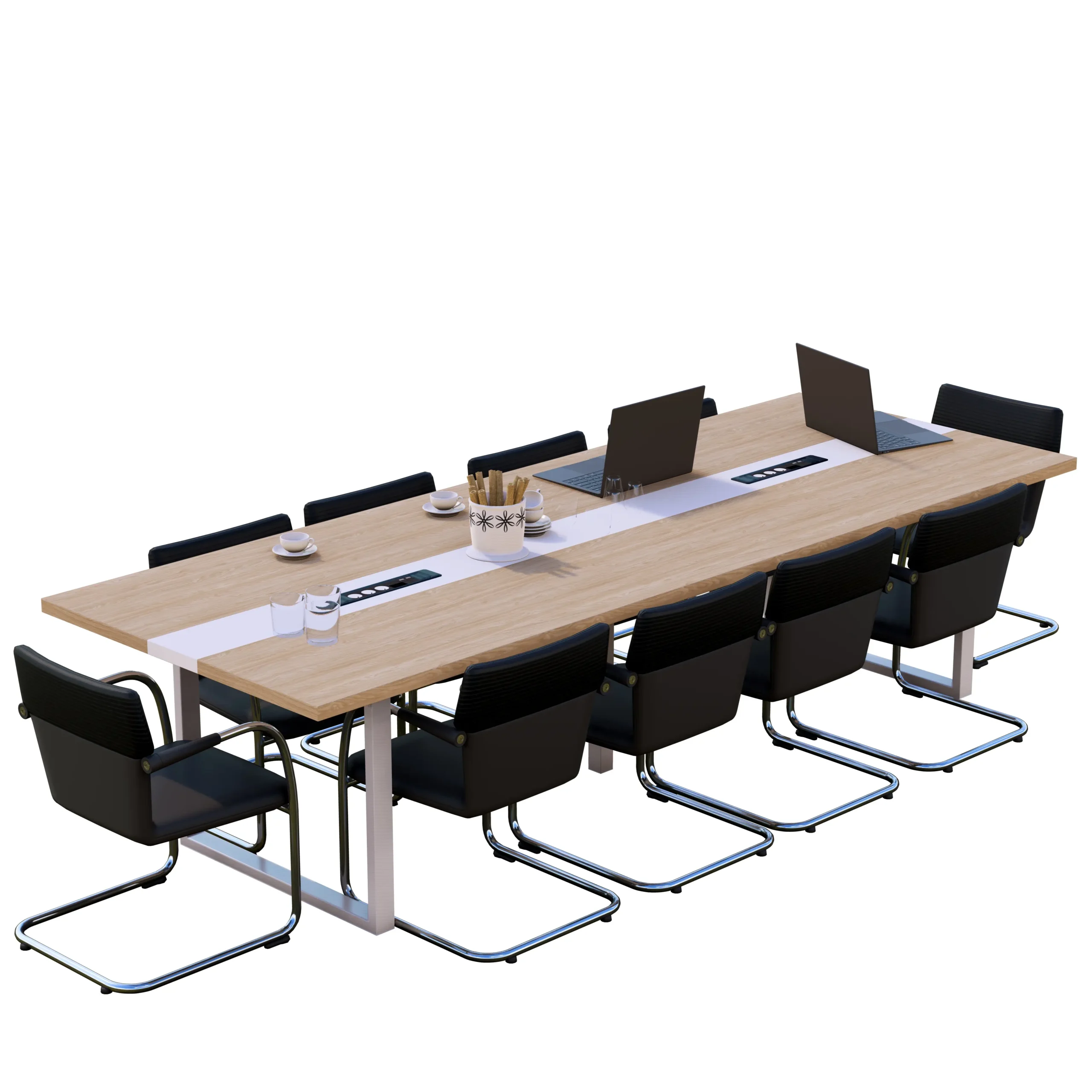 Dodatkowo stół można wyposażyć w funkcjonalne akcesoria, takie jak mediaporty konferencyjne, które zwiększają komfort użytkowania podczas spotkań i prezentacji.