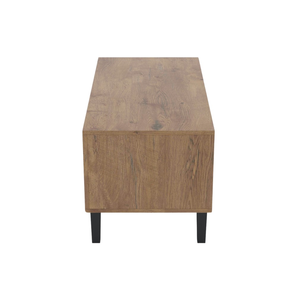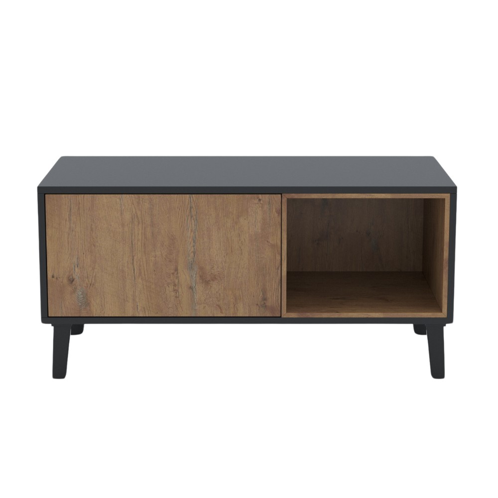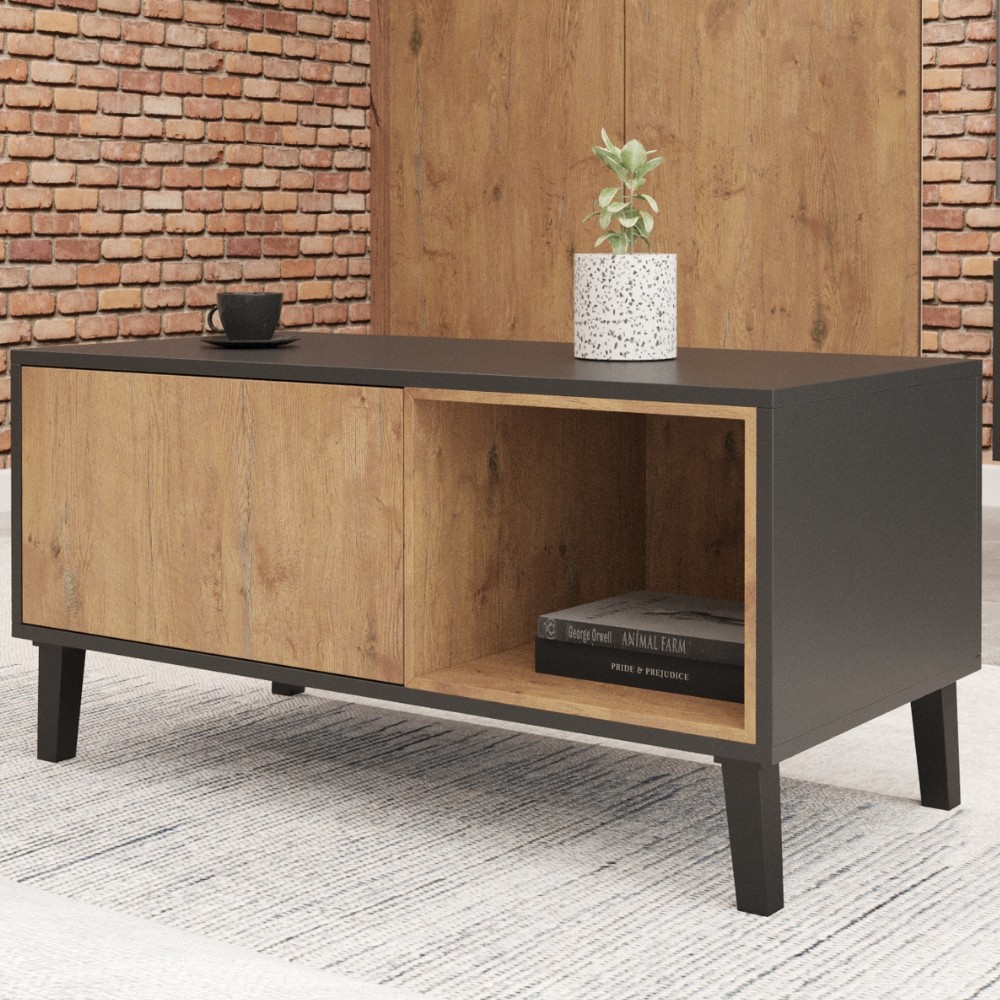 Otwarta półka po jednej stronie idealna do przechowywania książek, magazynów czy dekoracji. Natomiast zamknięta komora, która może służyć jako miejsce do przechowywania przedmiotów, które chcemy ukryć.
